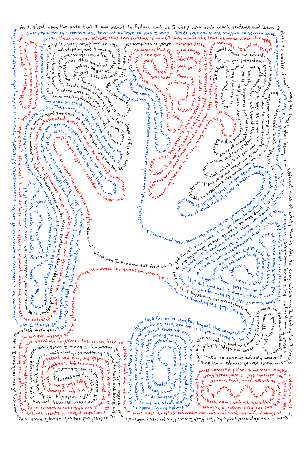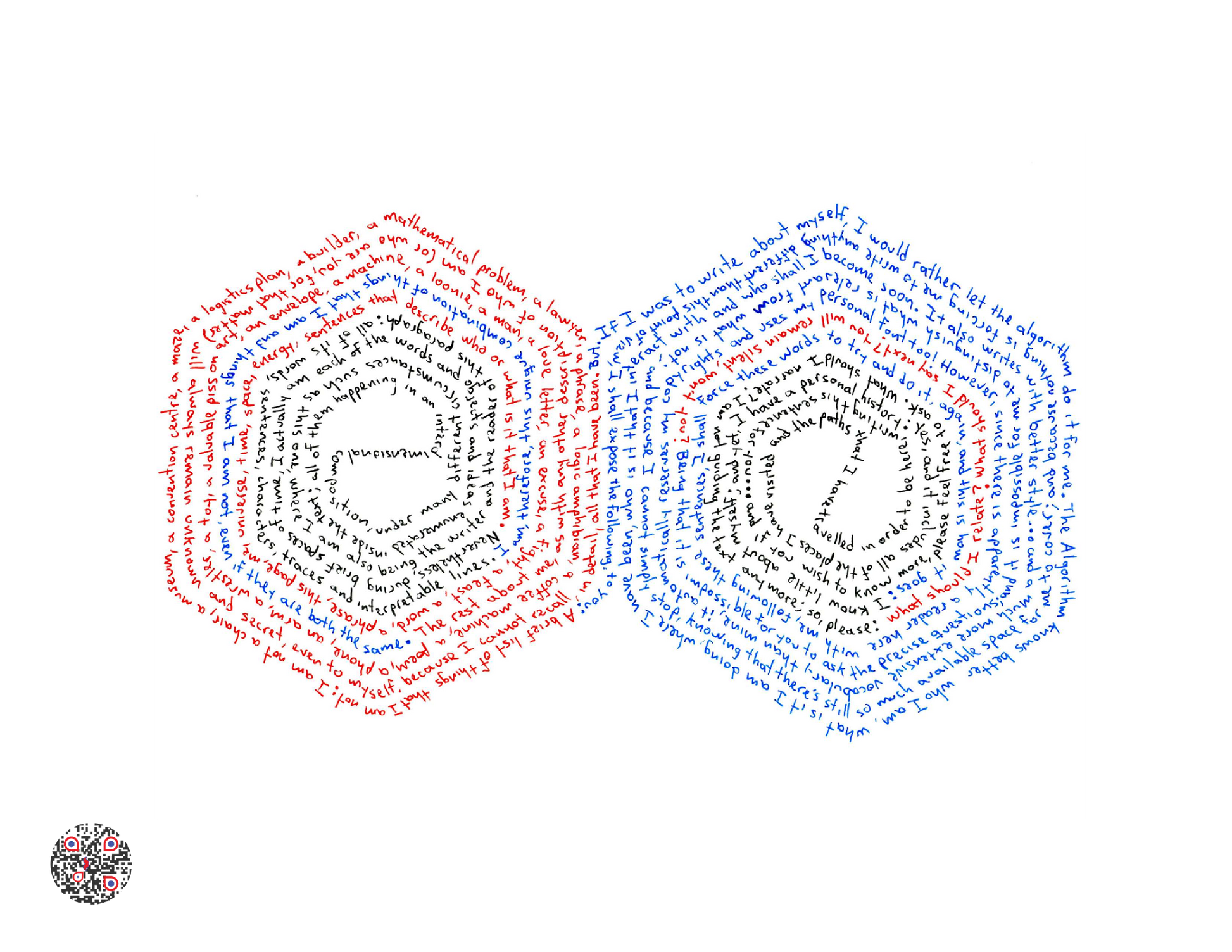 Son textos originales, escritos a mano con tinta indeleble y luego digitalizados y optimizados para su impresión sobre cualquier superficie. Los textos narran la experiencia del texto en sí mismo, que reflexiona acerca de su naturaleza de ser palabras que fluyen en el espacio, se extienden en el tiempo, se ocultan, se revelan, mientras piensan en nada.